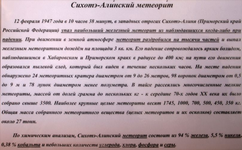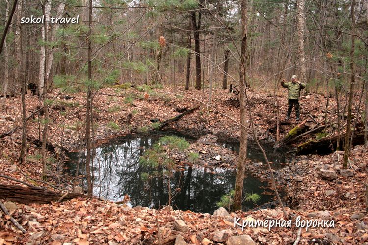 12 февраля 1947 года на Дальнем Востоке, в Красноармейском районе Приморского края, в западных отрогах Сихотэ-Алиня произошло падение железного метеорита. С небес на землю рухнула целая гора. В воздухе она взорвалась, высыпавшись на тайгу железными осколками, общая масса которых оценивается в сто тонн и более! Многие "капли" метеоритного дождя образовали воронки, не уступающие тем, что бывают от взрывов снарядов. Метеориты усеяли площадь примерно в 11 километров длиной и 4 километра шириной, образовав большое количество кратеров шириной до 26.5 метров. Сихотэ-Алинский метеорит уникален и входит в десятку крупнейших метеоритов мира. Согласно одной из версий метеорит являлся частью погибшей когда-то планеты Фаэтон. В земной атмосфере он рассыпался на сотни тысяч фрагментов и выпал метеоритным дождем. Место падения небесного тела вызывает заслуженный интерес туристов в качестве музейного экспоната под открытым небом на фоне незабываемых красот Сихотэ-Алинской тайги. Еще в 70-е годы прошлого века это место было объявлено метеоритным заказником, памятником природы и национальным достоянием. Место падения метеорита как космического объекта, кратерное поле, является Местом Силы. В ходе маршрута Вы познакомитесь с самим местом падения на Приморскую землю уникального космического объекта – кратерным полем метеорита, получите познавательную информацию о выпадении космических тел на Землю. Так же представится возможность почувствовать энергетику этого уникального места. Путешествие реализуется как многодневный маршрут в ходе которого посещаются и другие интересные объекты: река Иман (Большая Уссурка) и ее подвесные мосты, средневековое городище, национальный парк "Удэгейская легенда", староверы села Лаули ... Возможно приобретение фрагментов метеоритного тела.